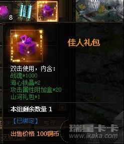 佳人礼包+100元宝 →战魂*1000,海心铁晶*2,攻击属性附加盒*20,山河礼包*1