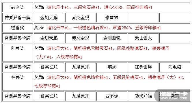 异兽卡牌-闪电貂*5、异兽卡牌-功夫熊猫*5、异兽卡牌-炎黄*5、造化丹大*20、灵兽圈*200、黑木令*200