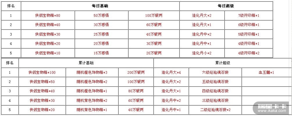 累计充值20000黄金,可领取:声望10000、兽魂丹大*3、侠侣宝物箱*100、造化丹大*2、幸运符*10