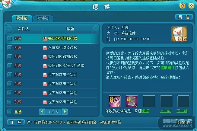 7) 取消每日签到功能后,为了补偿玩家,更新后系统将统一用信件返还玩家下一次可领取的奖励。