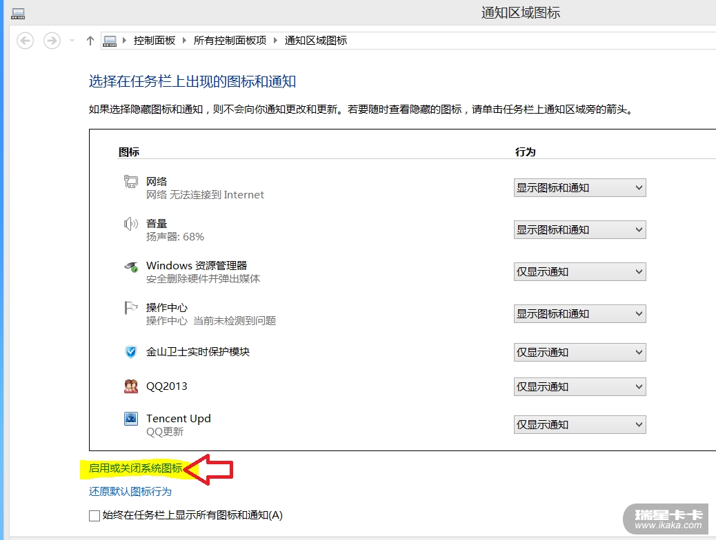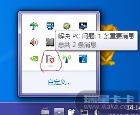 再次提醒:不建议彻底关闭任务栏中的操作中心提示。此提示图标有时会通过给用户非常有用的信息。比如:中了AVKILL之类的病毒和,这个图标上会有一个红叉。