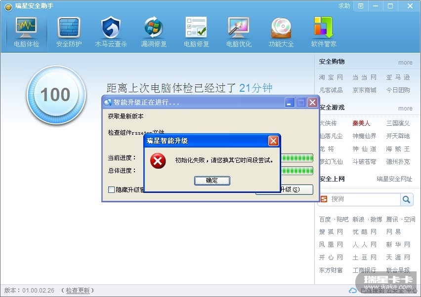 瑞星工程师,最近把电脑里装的360卸载换成了贵司的产品。但安装完后在点瑞星安全助手下方的“检查更新”后一直无法升级,老是显示初始化失败,都好几天了,还是这样!在开始菜单里找到并点击“修复安全助手”后也没有任何反应,望帮助解决,谢谢!