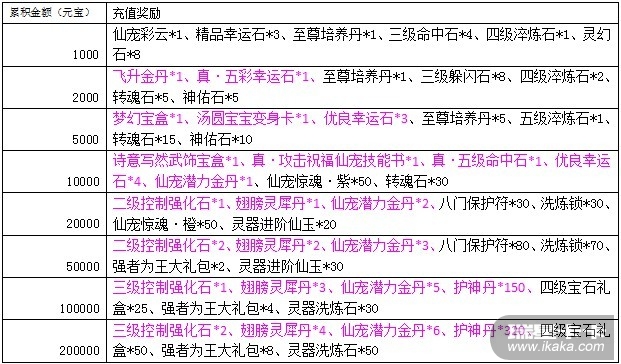 温馨提示:单笔充值奖励可重复领取,不设上限,奖励物品均为绑定,以信函方式发放。3累积充值大礼活动时间:2013年04月08日00:00至04月12日23:59活动范围:全服活动规则:活动期间,累积充值达到指定额度,还可以获得以下超值丰厚的奖励哦!