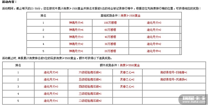 活动六:单服消费积分排行 活动时间: 2013年4月15日活动更新后-2013年4月16日23:59 活动内容: 活动期间,截止每天的23:59分,您在游戏中累计消费≥1500黄金并排名本服前5名的将会被记录排行榜中,根据您位列消费排行榜的位置,可获得相应的奖励:
