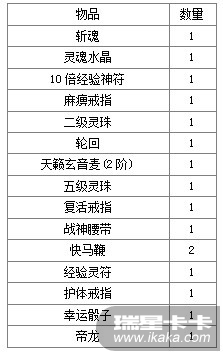 阶);五级灵珠;复活戒指;战神腰带;快马鞭;经验灵符:抗体戒指:幸福骰子;帝龙;