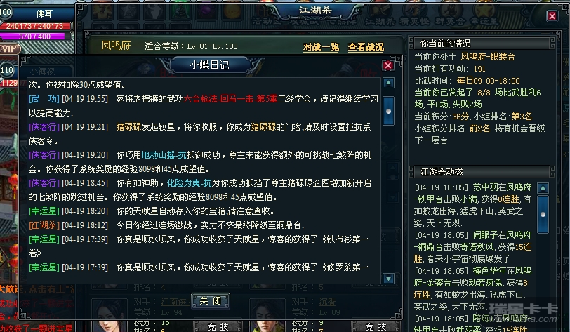 今天的江湖杀佛耳第三名(当前你已发起了 8/8 场比武胜利6场,平0场,失败2场.当前积分:36分,小组排名:第3名小组积分排名 前2名 将有机会晋级下一层台),可小蝶处却是[江湖杀] [04-19 18:12] 今xxx经过连场激战,实力不济最终降级至铜鼎台. 就给了20名望值 实际应给300名望值、35功勋。