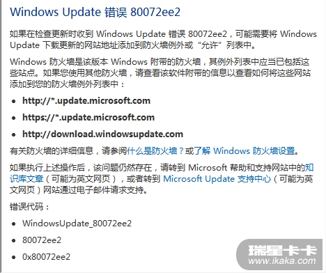 80072ee2,系统自带的帮助提示是:如果在检查更新时收到 Windows Update 错误 80072ee2,可能需要将 Windows Update 下载更新的网站地址添加到防火墙例外或“允许”列表中。