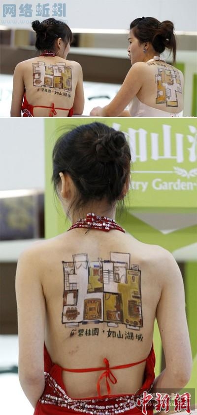 月21日,2013南京春季房地产商品交易会在南京国际博览中心举行,一家开发商促销出“奇招”,请来模特助阵,将热点户型彩绘在模特后背上,以此博眼球。