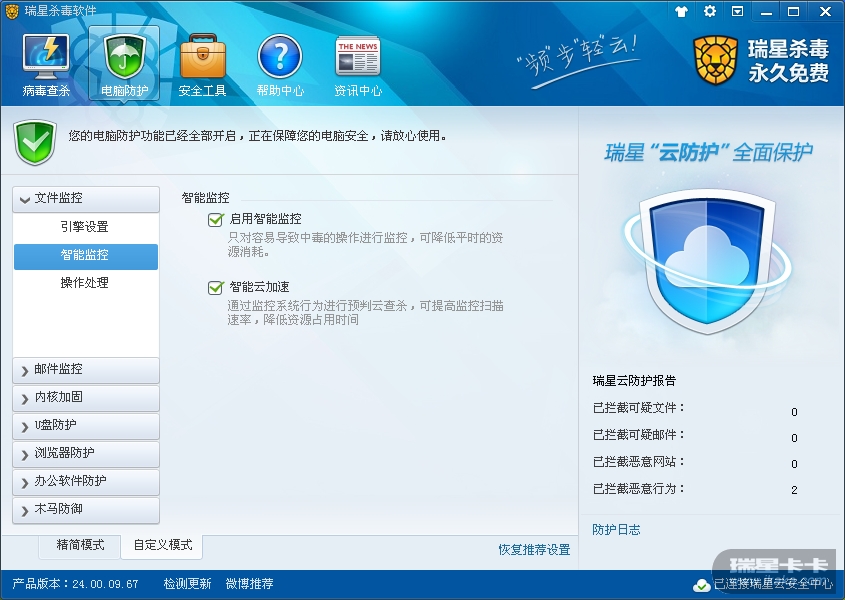 智能监控是对操作系统的所有可感染行为进行拦截。