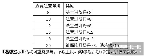 活动期间,将灵戒洞天里任意妖灵法宝等级提升到指定等级,可获得额外系统赠礼。