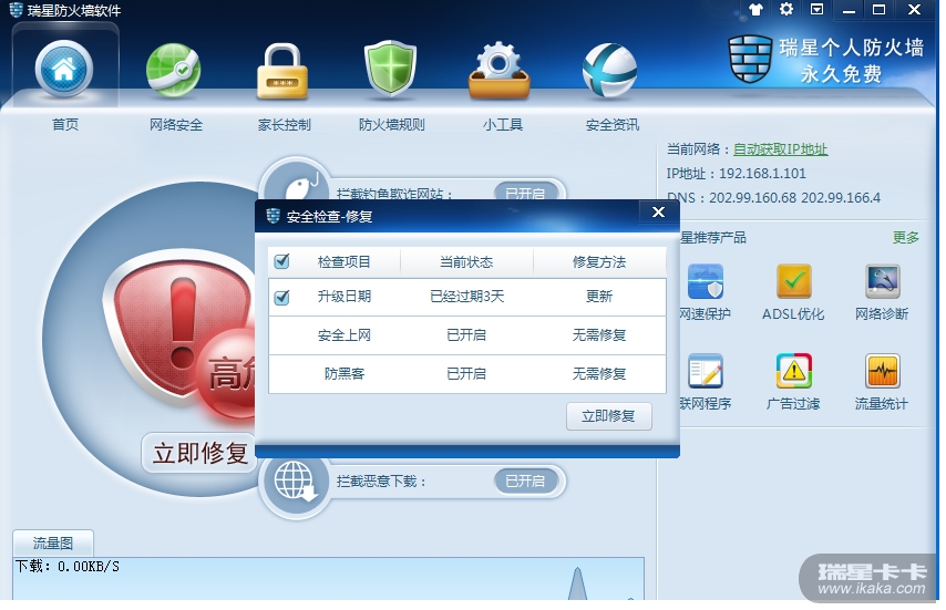 以前记得用瑞星防火墙的时候,点升级,他就会把这个检查修复框关掉。显示进度条,并且可以最小化到任务栏。这个版本点了立即修复按钮没什么反应,只能从下面的流量框中看出有大的波动,在升级,不知道的还以为假死了。