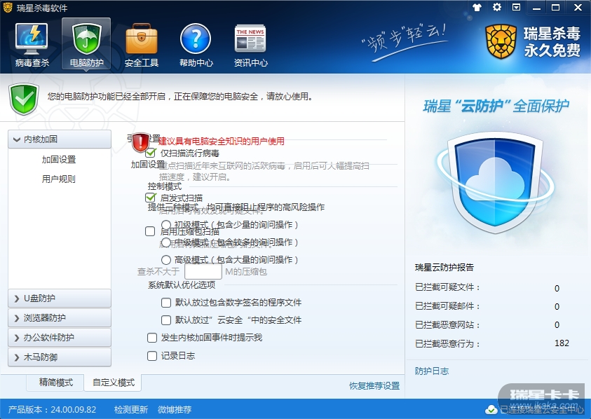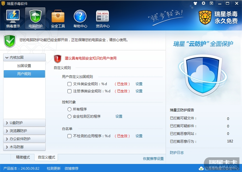 2.在未安装实时监控的情况下,电脑防护的自定义界面有文字堆叠和异常现象。修复后问题依旧。