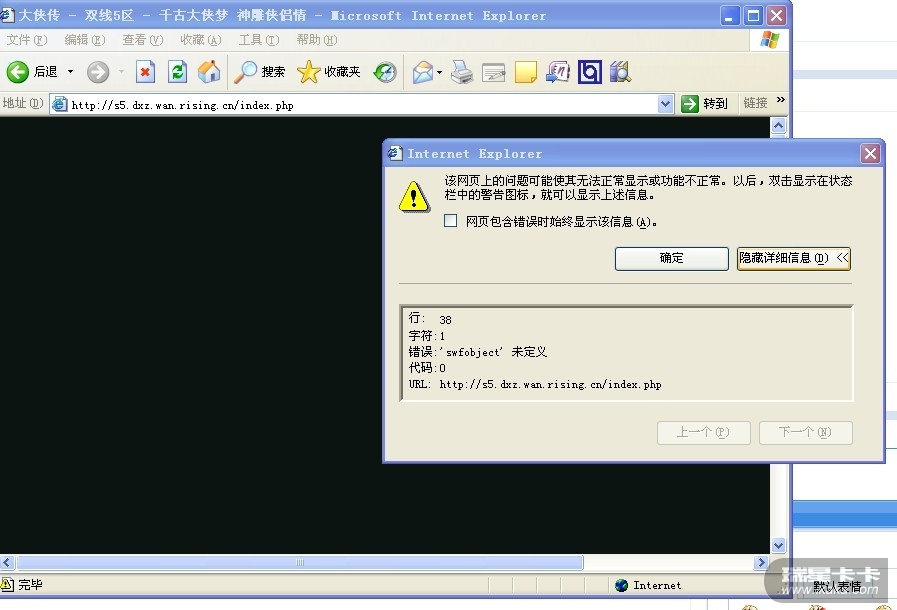 你们怎么不回答我的问题啊,我在登陆界面点登录5区,然后他们出界面就全黑,左下角出个黄色三角叹号,双击点开是swfobject未定义,我看现在网页上这种现象很频繁,都是大侠传的问题,会不会是网页有什么脚本调试不对,请解决一下行吗?我晚上回家玩就没事,单位多台机器都是这样,我是五区的,游戏名字卓枫,VIP4,能不能解决一下啊,老上不去游戏都被别的玩家落下了,请求你们了