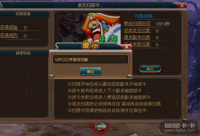 你好,我是6区的摩奇宝宝,游戏内的活动——多人副本——参与活动——亲友扫荡,故障两天了,用不起,求解决。昨日显示的是“攻击失败,请重试”;今日显示的是“VIP0开启此功能”。