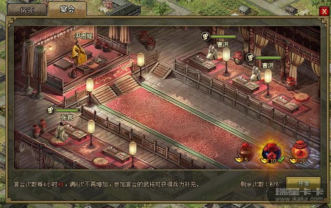 使用金币买酒召开宴会,恢复玩家当前拥有的全部武将的兵力(3种:50%、100%、200%效果)