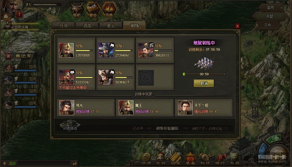 l 击败特定的NPC之后开放。消耗时间训练自己的将士,每隔1分钟会提升主将和所带武将的经验值。