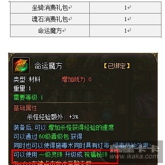 【60级晋级包】:命运魔方*1、20礼券*1、4级经验神符*1、5级离线经验丹*1、高级怒气丹*5、千年玄参*2、千年冰莲*2;