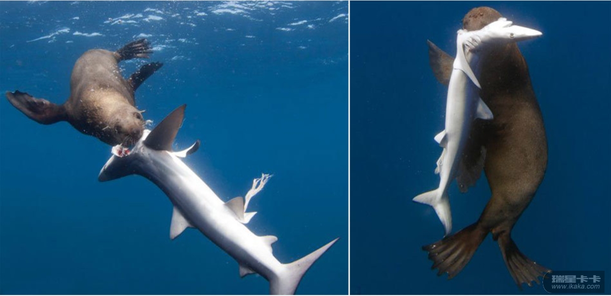 一群潜水员在南非好望角水下拍摄到了一头海豹迅速捕食5头鲨鱼的骇人画面。当时他正和其他几人在潜水,他在水下发现了一群鲨鱼,均约1.1—1.4米长。突然一头大海豹迅速游向鲨鱼群,在短短的时间内捕杀了四头鲨鱼,一个小时后又有一头鲨鱼不幸成了它的盘中餐。
