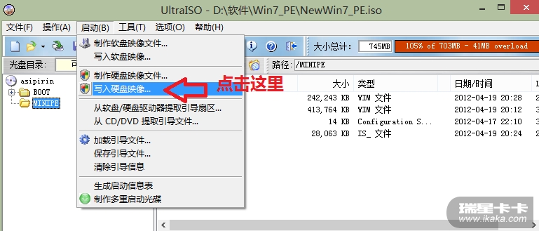 4、点击UltraISO工具栏上的“启动”,然后点击“写入硬盘映像”。