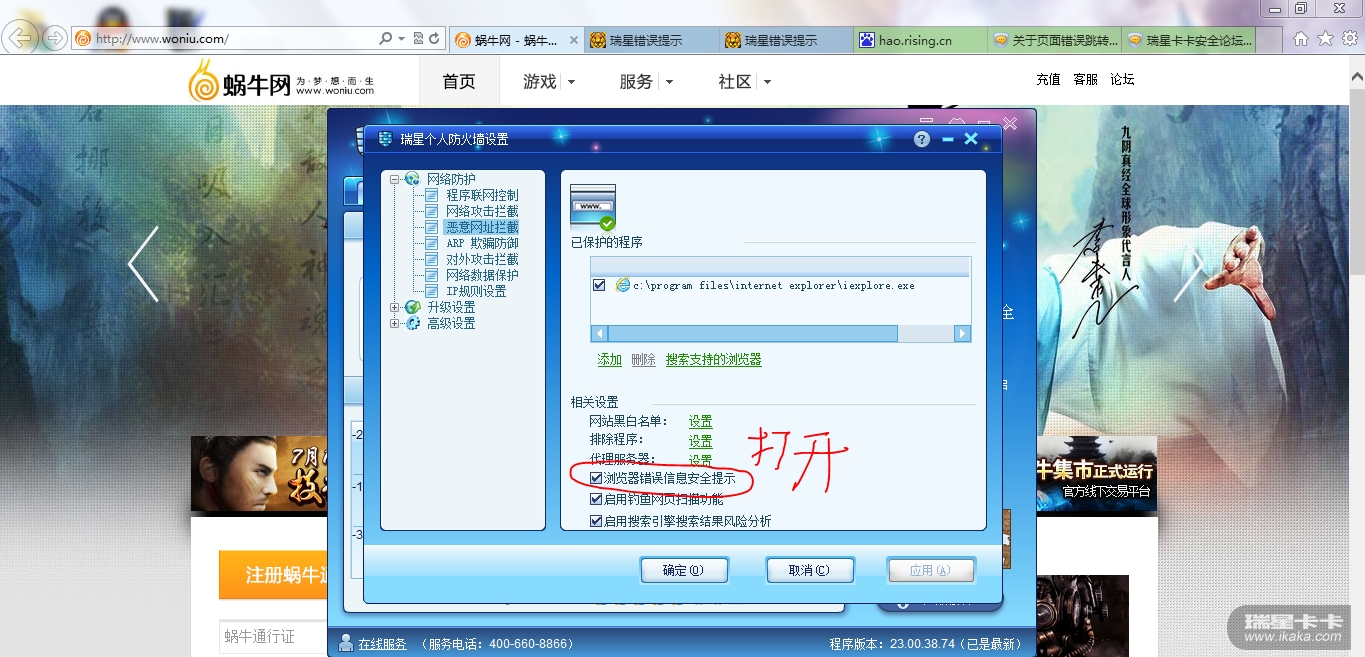 什么垃圾软件,正常的网页别的电脑可以打开,安装了瑞星防火墙的打不开,提示错误,必须把瑞星防火墙设置里面浏览器错误信息安全提示关了才可以打开!!!