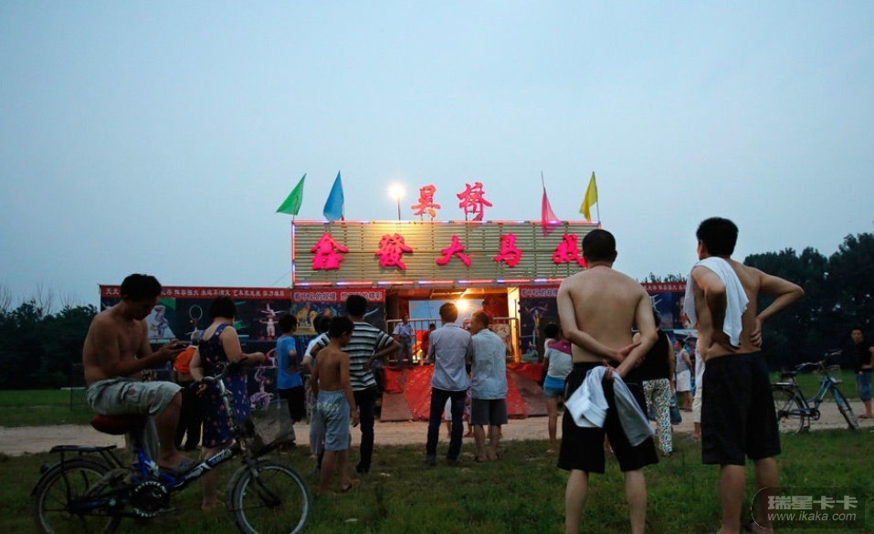 7月17日,北京,光着肩膀的民工观看流动马戏团的路边杂耍。