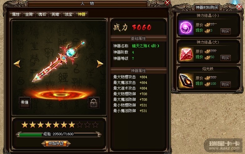 级方可开启。获得神器后,你可以使用神力结晶、焰光铁等材料对神器进行升级,获得更强大的属性加成。