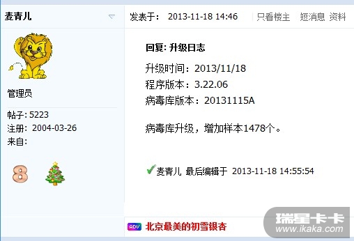 “krwy0330”,瑞星工程师12说的对,前几天更新了病毒库。如下:(有图为证)