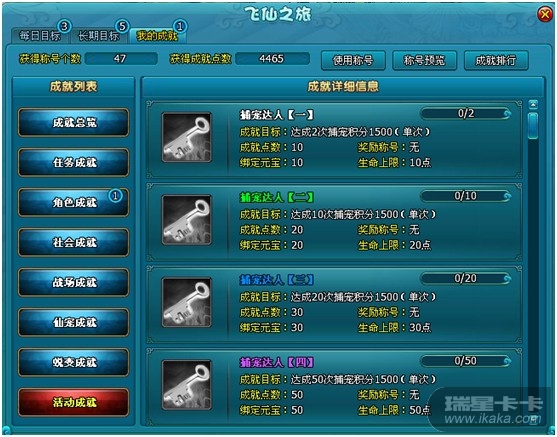 六.成就优化1.飞仙之旅增加活动成就。(捕宠达人成就,种花成就,火眼金睛成就,七彩泡泡成就,福星高照成就)
