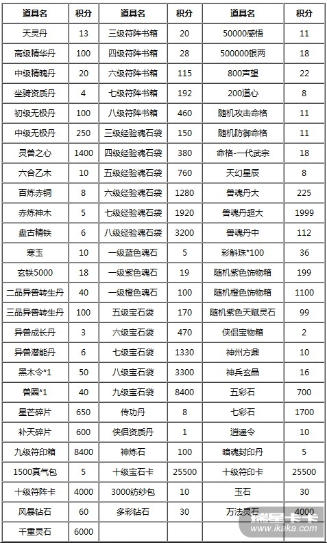 极品道具卡:可兑换指定道具中的一个(孟尝令-化缘僧、孟尝令-诸葛连英、孟尝令-凌竹息、通灵玉牌-玄帝、通灵玉牌-炎黄、通灵玉牌-羲凰、特级无极丹、红色神兵)