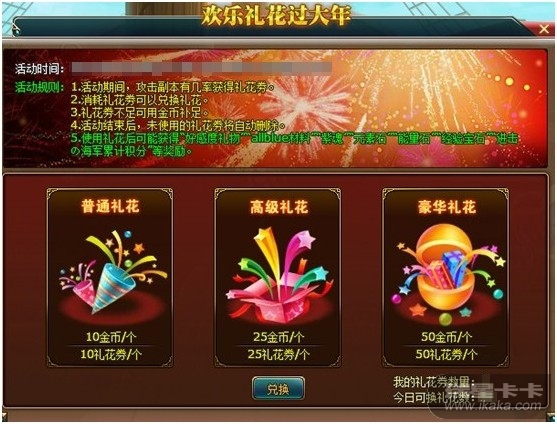 2.消耗礼花券可以兑换礼花,也可用金币购买礼花;