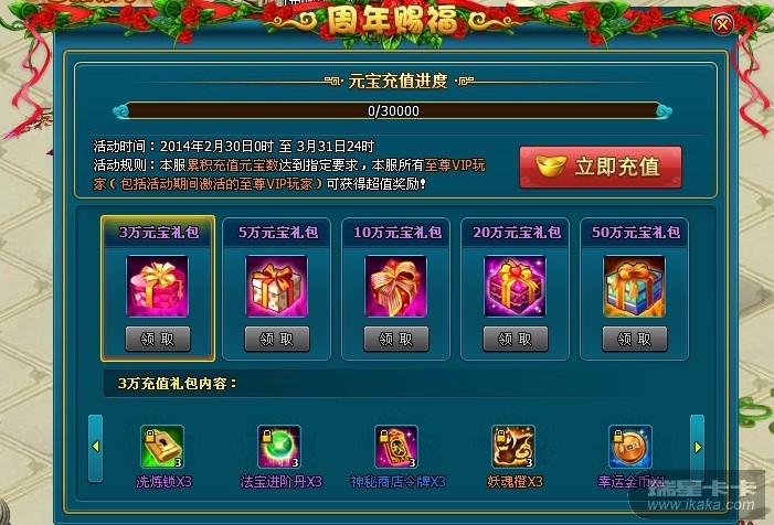 周年赐福活动:每个服的充值达到一定元宝数时,将会对该服所有至尊VIP玩家发放礼包奖励。