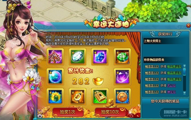 幸运大连抽活动:玩家花费30元宝可以进行一次抽奖,10%的元宝会累积到奖金池里面,玩家有机会获得奖金池中所有的元宝以及霸天虎坐骑等珍贵道具。
