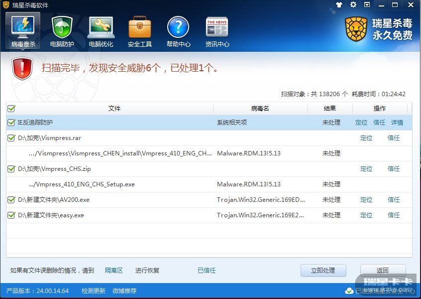 结果:处理病毒时 ,瑞星主程序报错并崩溃