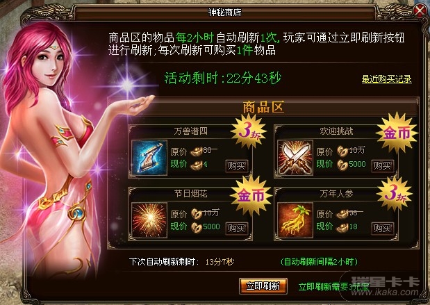sss神秘商店中有4件打折特价商品出售。商品区的物品每2小时自动刷新一次,您也可以通过“立即刷新”按钮进行刷新,每次刷新可从四件商品中挑选其中一件购买。