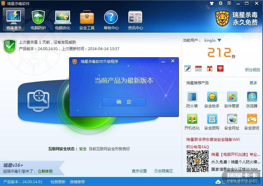 回复: 瑞星v16+无法更新到最新版,手动点击更新没反应老提示已是最新版