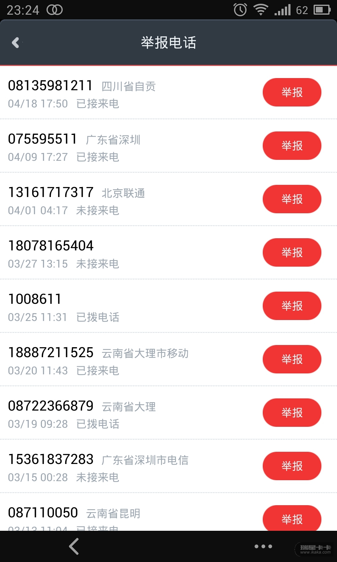 7.举报电话,咱们能丰富一下电话的地址库么?但就我这张照片为例,0813是四川自贡的固话,075是广东深圳的固话,0872是云南大理的固话,0871是云南昆明固话,咱们能在后面加上固话两个字吗!!!!!18078165404是广西南宁电信,你能识别一下么?1008611是云南大理移动公司客服电话,能显示吗?15750247292是云南大理移动,识别吧。。。。瑞星加强地址库吧。。。。。已经不想再说什么了。。