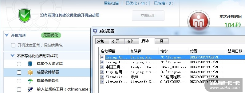 我用ctfmon.exe做实验。加入注册表的启动项后,瑞星是可以扫描出来的。后来,我从瑞星优化中点击禁止。再次,在注册表中添加ctfmon.exe自动启动,瑞星就是扫描不出来。