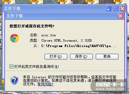 1、开机后弹出两个文件下载的提示对话框,分别是mini.htm和cmaiprog.htm,提示“打开、保存、取消”三个选项。