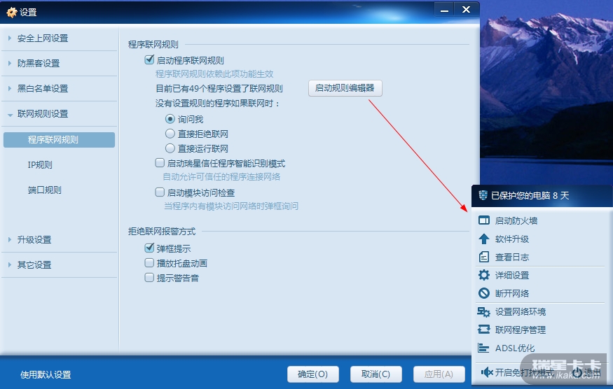 建议防火墙托盘图标右键添加“启动规则编辑器”,谢谢