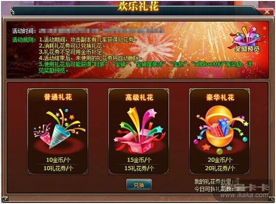 2.消耗礼花券可以兑换礼花,也可用金币购买礼花;