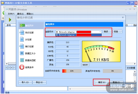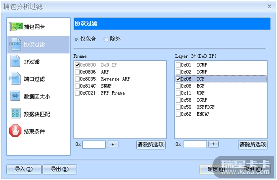 在弹出的捕包分析过滤窗口选 【协议过滤】,在【协议过滤】里勾选TCP,如下图: