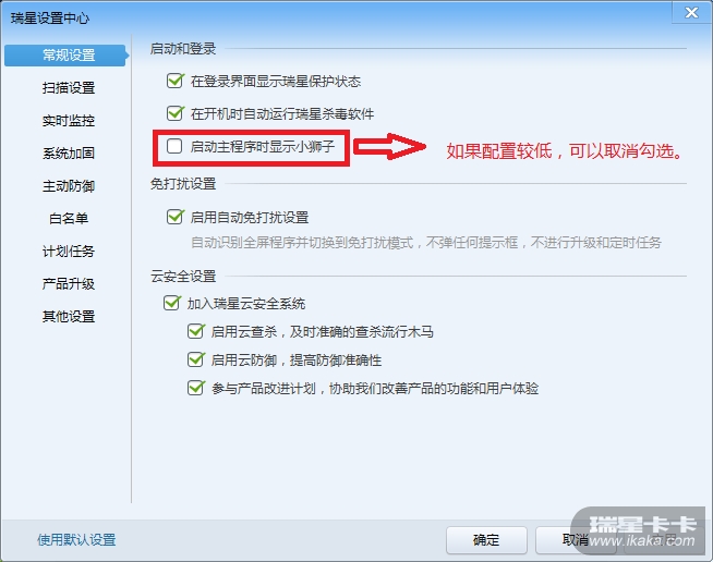 常规设置:这一页,没有什么需要特别设置的,在有些配置比较低的机器上,可以取消勾选"启动主程序时显示小狮子"选项,这个虽然是瑞星的特色。不过,没什么实际用途。