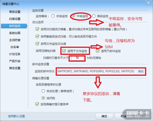 扫描设置:将扫描压缩包选项文本框中的文本改为50,因为在实际的PC上,很多压缩包都大于20M。发现病毒的处理方法呢,建议选择自动处理,有利于增强安全性,第一时间干掉病毒!不过。。个人比较喜欢手动处理。