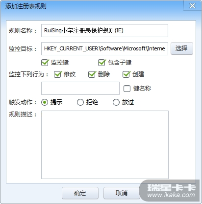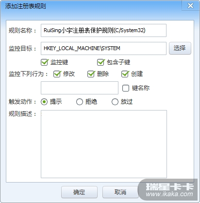 请注意!经本人的WIN7系统实机测试,发现RuiSing小宇注册表保护规则(C/System/32)过于严厉,会造成询问过于频繁,请谨慎使用,或不推荐使用。此问题后续将会修改。请注意!如果您的系统是XP系统,那么RuiSing小宇文件保护规则(IE)的文件路径为:C:\WINDOWS\ie8(其它特殊情况自行判断。)