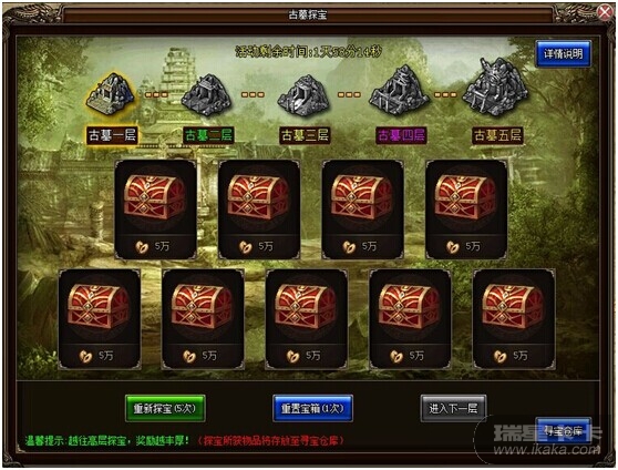 活动说明:1、古墓探宝共分为五层,每层分别有9个宝箱,点击宝箱可抽取丰厚的奖励。