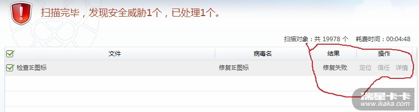 快速查杀后,修复IE图标失败,每次都能查出,但修复总是失败!!