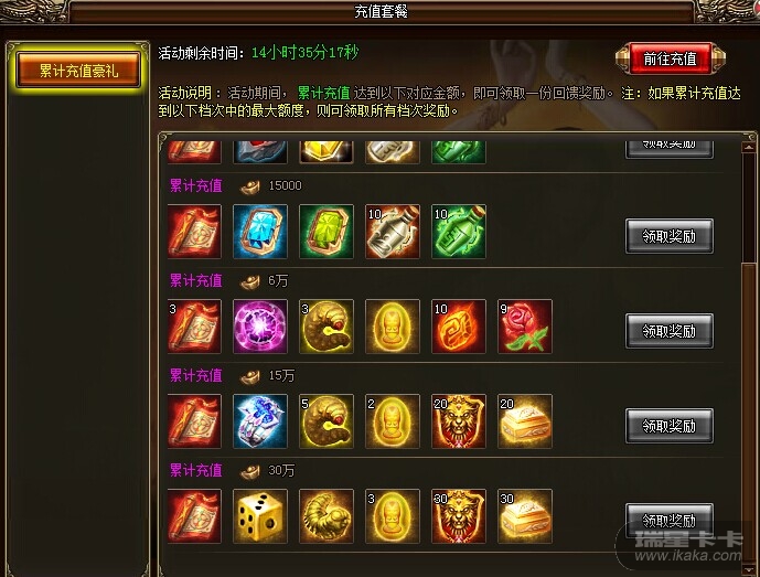 :活动期间,累计充值达到一定金额,即可领取一份对应回馈奖励。如累计充值达到最大额度档次,则可领取所有档次奖励。