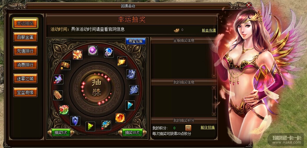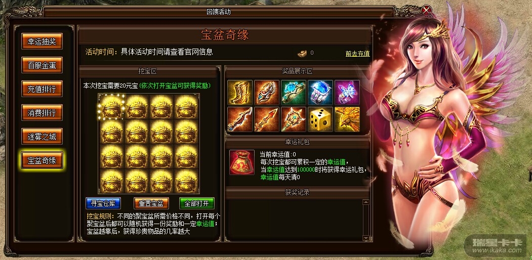 活动内容:幸福,就是那提手间的一瞬感动。消耗一定元宝翻开幸运卡,就能获得相应的随机奖励一份,同时每次翻卡能获得一定的幸运值,幸运值越高,获得大奖的几率越大!