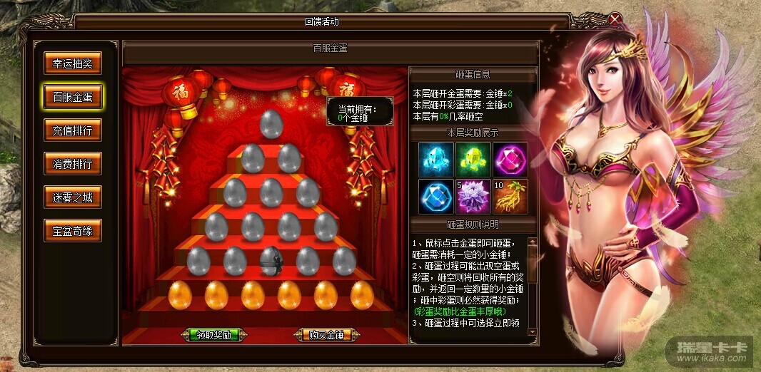 活动内容:小百服砸金蛋,使用小金锤砸蛋每层都有一次砸蛋机会,砸出礼品后可以选择砸下一层或直接领取已砸出奖励,除最后一层外,每一层都会有一个空蛋,砸到空蛋则回收所有奖励重新开始砸蛋,并返还一定量的小金锤。越高层的金蛋砸出的奖励价值越高哦!