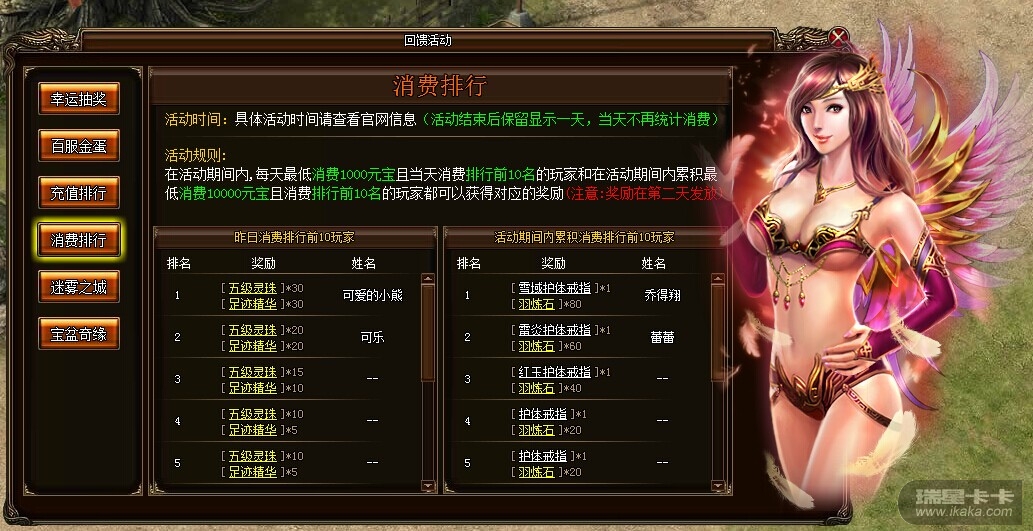 活动四、消费排行榜,优惠大回馈活动内容:在活动期间内消费得越多,优惠返利越大。1.在活动期间内,当天消费元宝排行前10的玩家且最低消费1000元宝都可以获得对应的奖励,奖励会在第二天发放,玩家上线就会在任务栏的右侧收到奖励提示。请给予背包足够的空间2.在活动期间内,累积消费元宝排行前10的玩家且最低消费10000元宝都可以获得对应的奖励,奖励会在活动结束后第二天发放给玩家,玩家上线就会在任务栏的右侧收到奖励提示。请给予背包足够的空间活动奖励:每日消费:名次